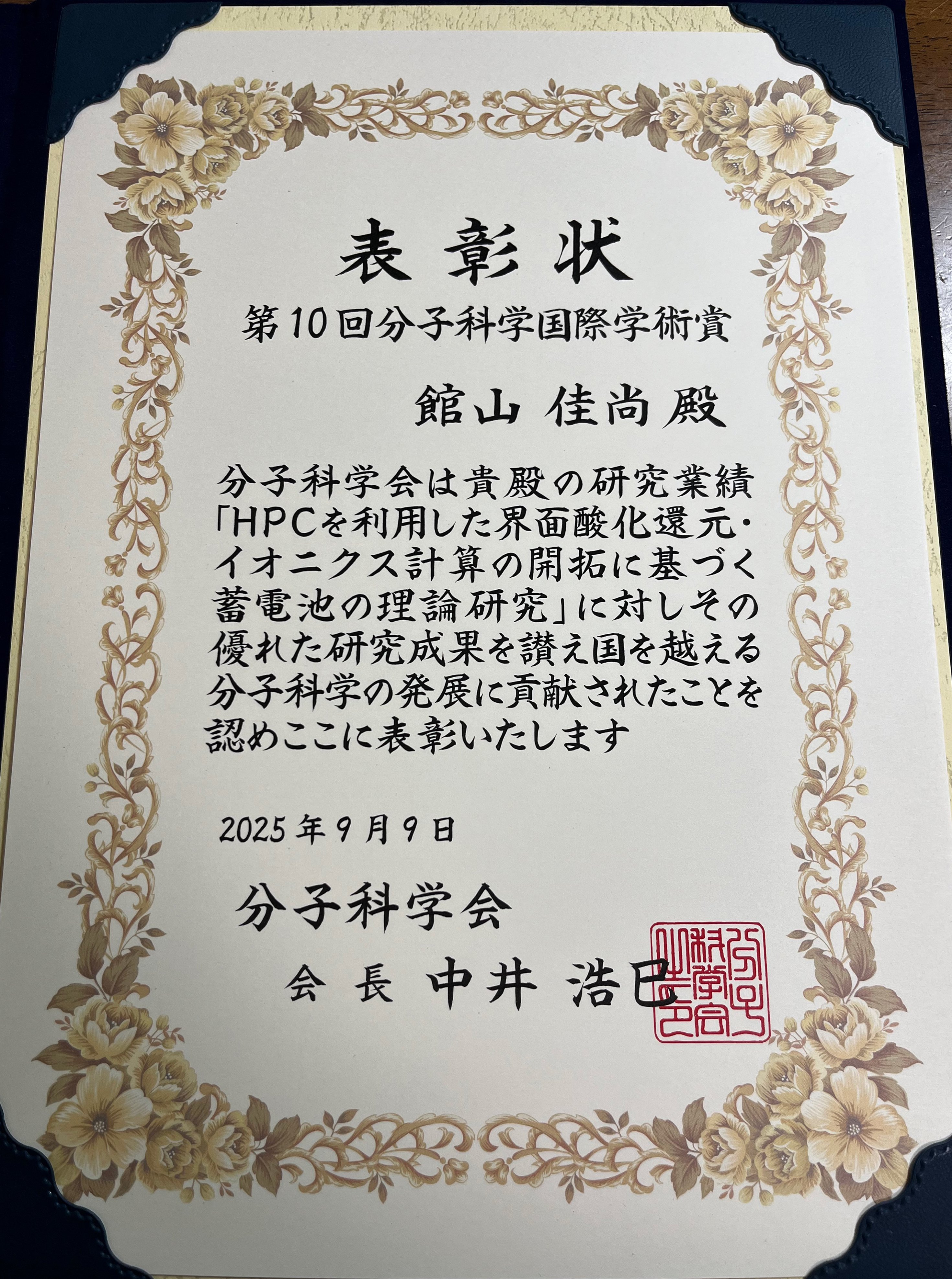 館山・安藤研究室の館山佳尚 教授が、 第10回分子科学国際学術賞を受賞しました。
